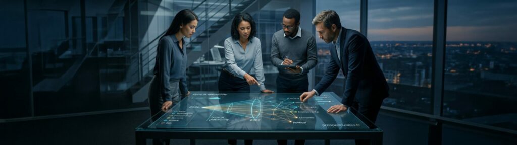 Chaque démarche débute par un entretien de cadrage permettant de définir le périmètre temporel et les variables critiques de votre environnement. Que votre horizon soit fixé à 2040. ou qu’il s’agisse d’analyser une rupture imminente, nous co-construisons le dispositif adapté.